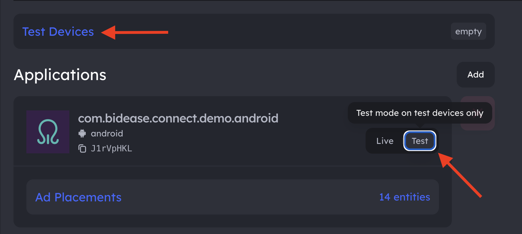 - Navigate to Test Devices and add the devices you want to test on — use IDFA (iOS)